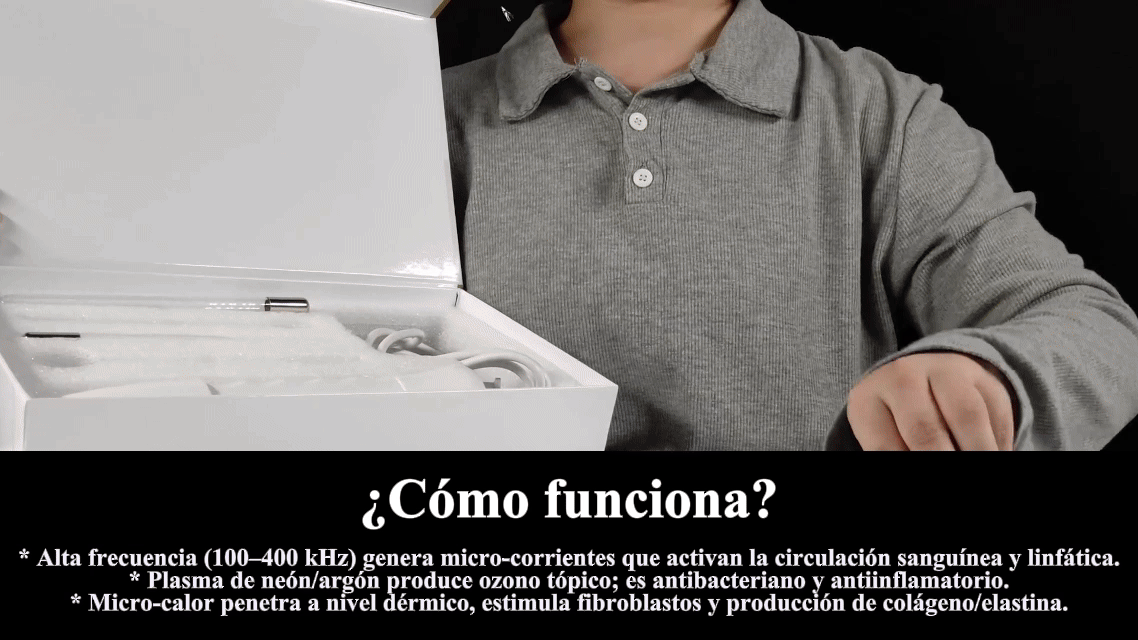 No hay riesgo de quemadura. La alta frecuencia trabaja con micro-descargas de muy bajo amperaje y calor suave (≈ 1 °C). Sentirás solo un cosquilleo tibio; si pica, basta con bajar la intensidad.